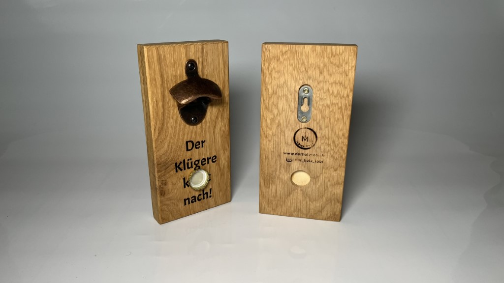 Von hinten ist ein Magnet in das Holz eingelassen, sodass der Kronkorken beim Runterfallen aufgefangen wird.