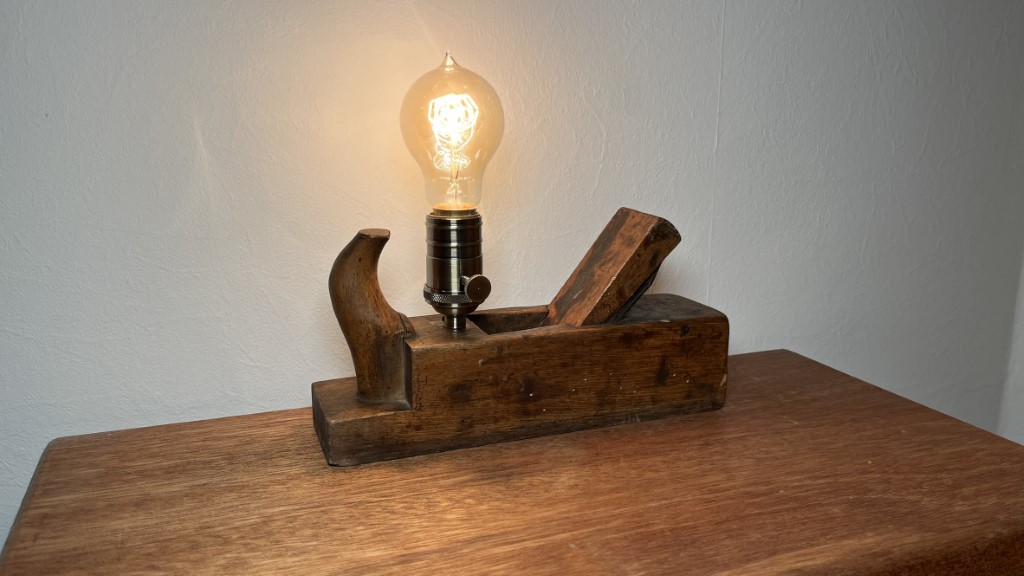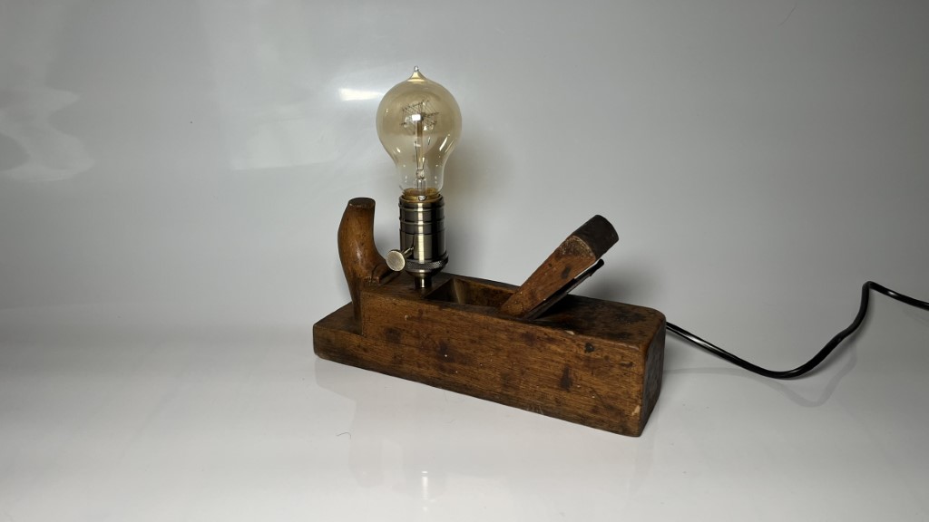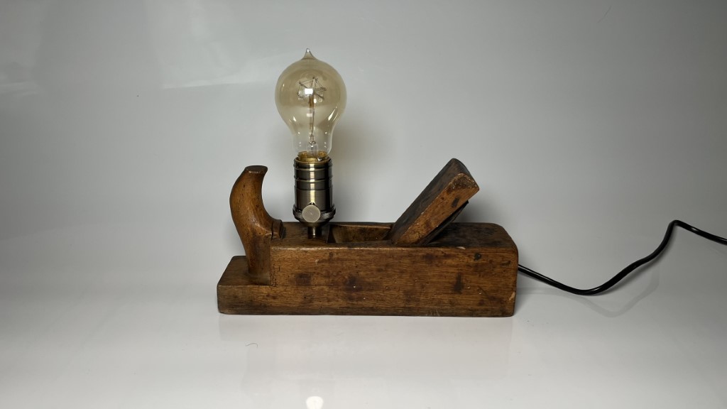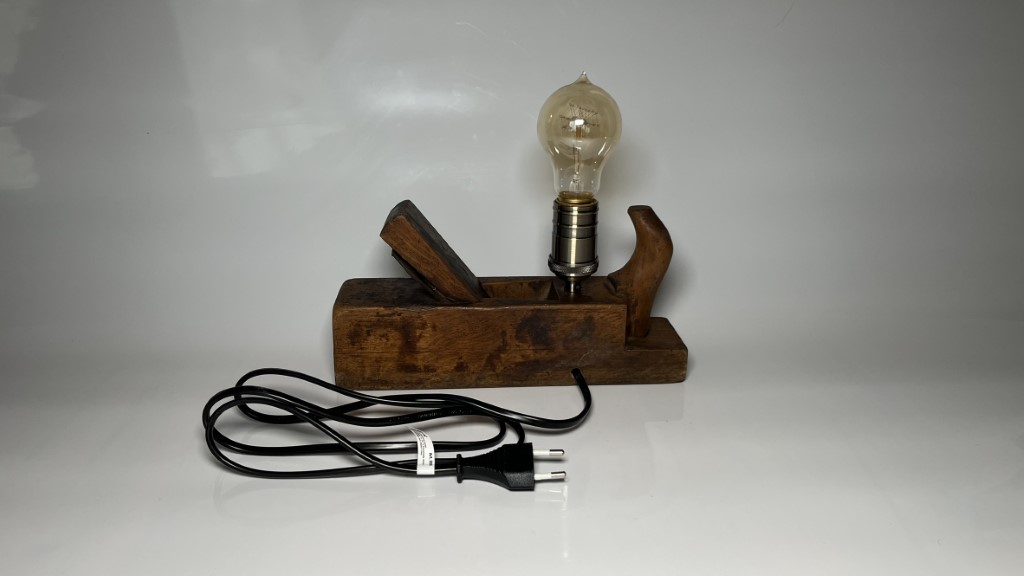 Upcycling Produkt. Lampe aus altem Hobel gebaut, mit Vintage Glühbirne.