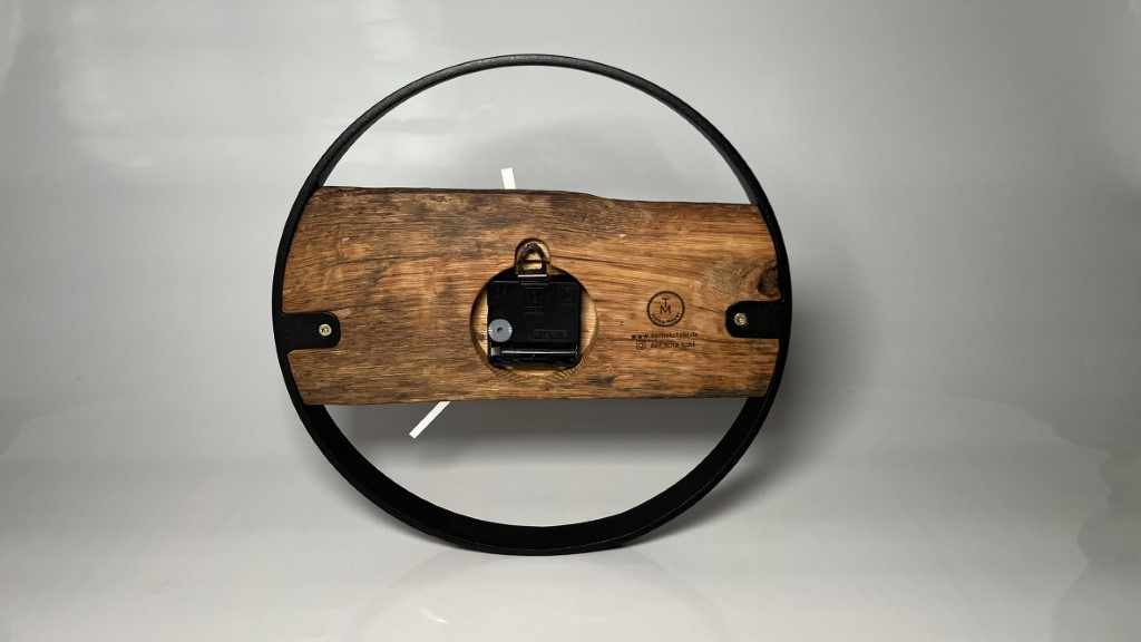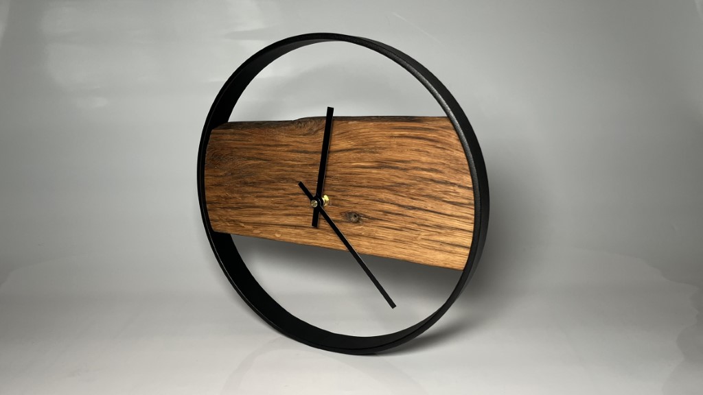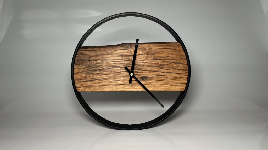 Wanduhr aus Eichenholz. Der Metallring wurde pulverbeschichtet.