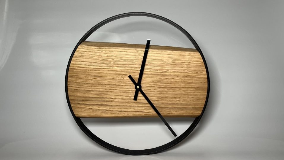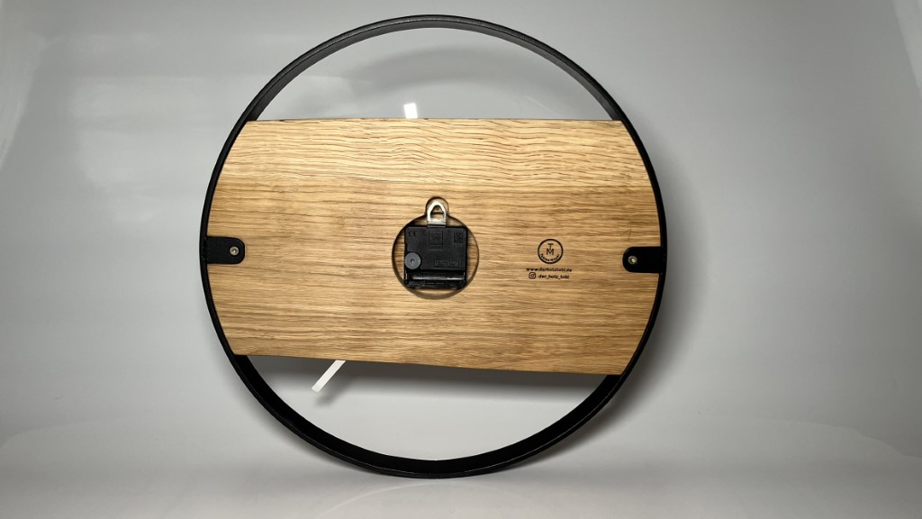 Wanduhr aus Eichenholz. Der Metallring wurde pulverbeschichtet.
