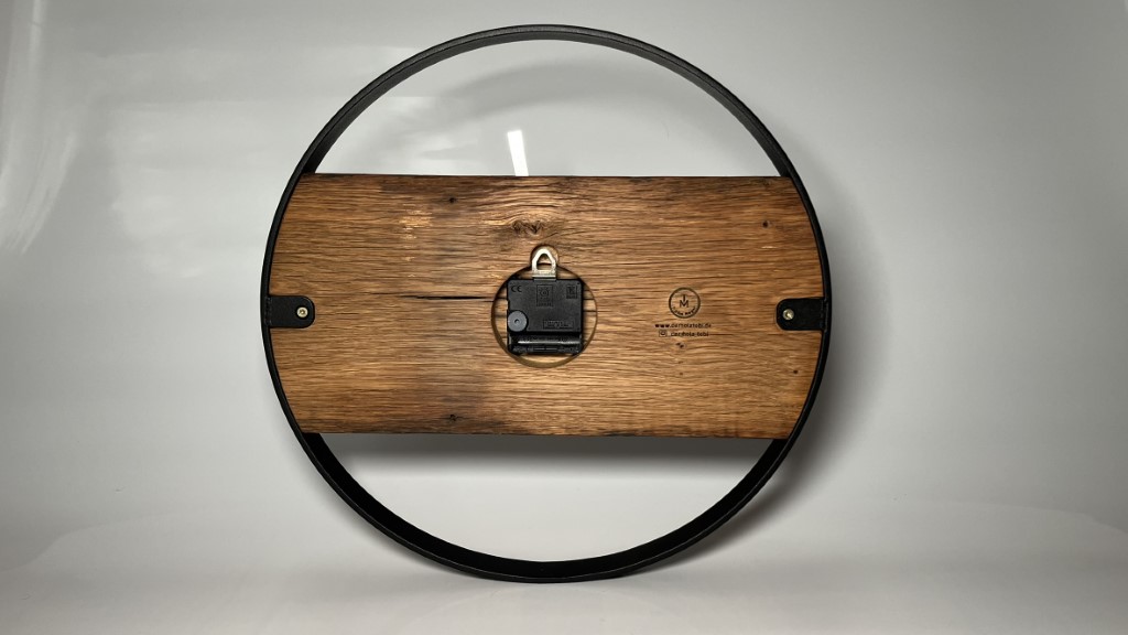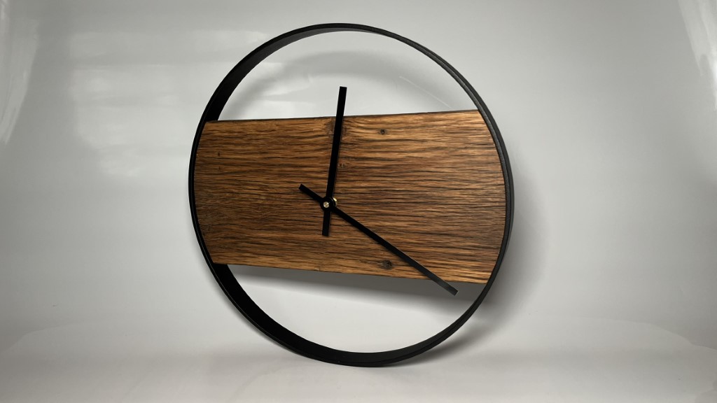 Wanduhr aus Eichenholz. Der Metallring wurde pulverbeschichtet.